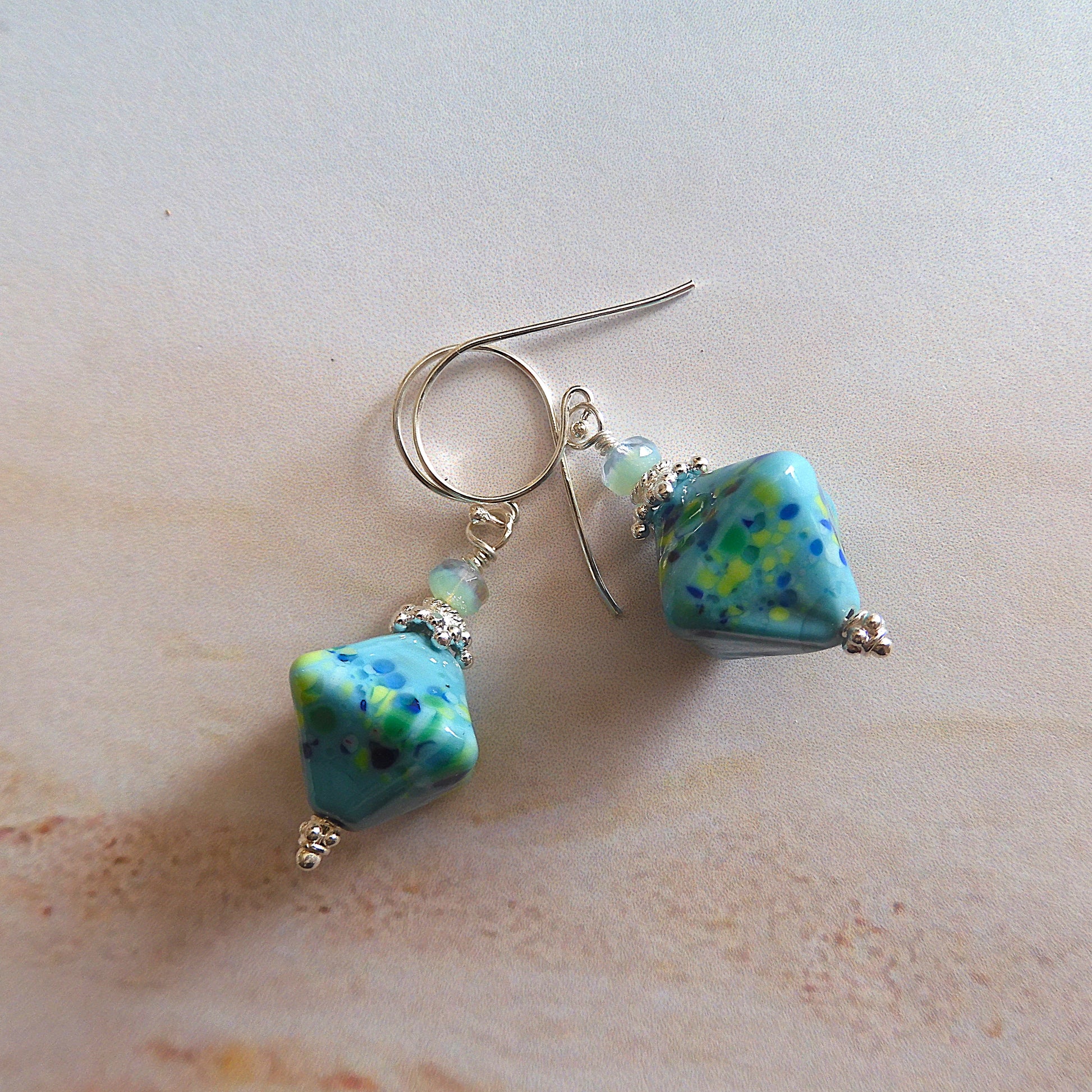 Immerse yourself in the tranquil beauty of the sea with these handcrafted lampwork earrings, featuring a mesmerizing blend of blue, green, and lapis hues. Each bead is crowned with sterling caps, a small Czech glass bead and finished with matching sterling silver ear wires, offering a refined touch of coastal charm. Whether you're gifting a loved one or adding to your own collection, these earrings bring a graceful splash of ocean magic to any look.