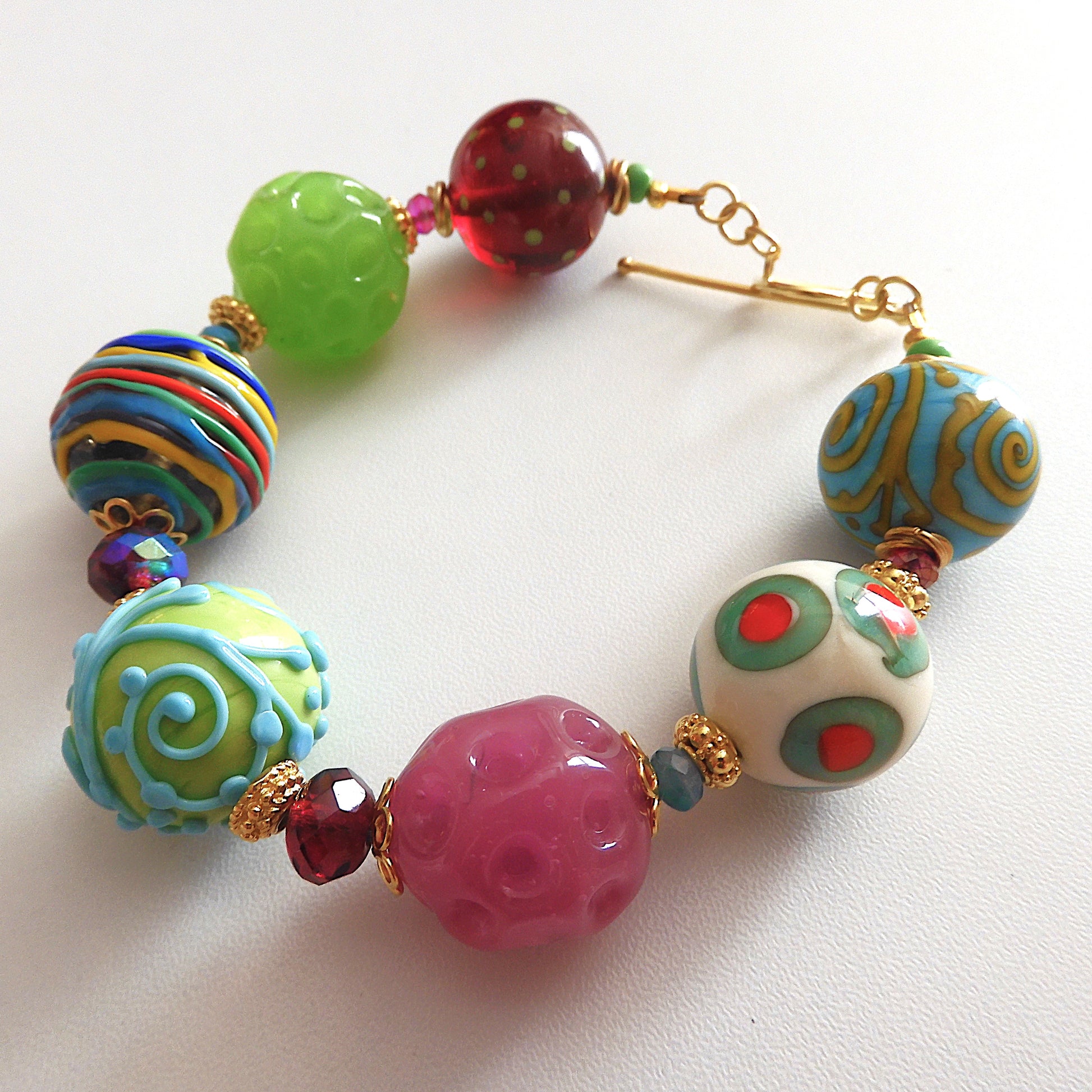 For lovers of art glass, this handcrafted lampwork glass bead bracelet is fresh and vibrant. Seven round beads in spring colors of turquoise, pink, lime, blue and yellow and a touch of red combine to make this a real statement piece. Each bead measures approximately 2cm in diameter.