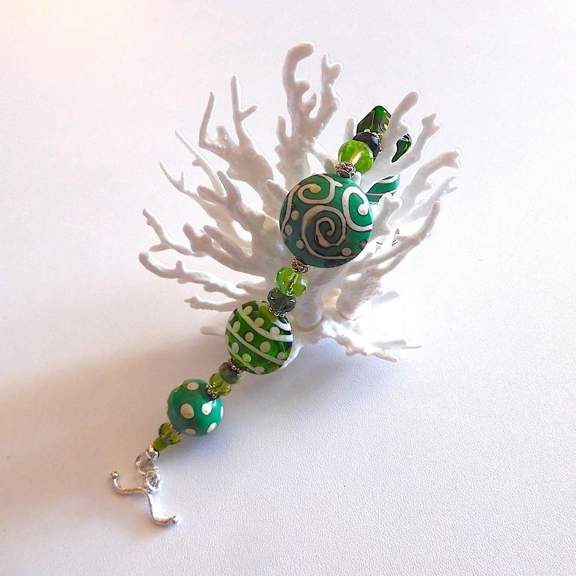 This handcrafted lampwork glass bead bracelet in striking shades of jade, emerald and ivory reflects the depths of the ocean and the green of the land. 5 assorted shaped and patterned lampwork beads combine to make this a statement piece. Sterling Silver spacers separate each bead along with Czech glass rondelles. The bracelet is finished with a simple Sterling Silver round toggle. This bracelet sits flat on the wrist and makes a great focal piece to add other layering bracelets to. Bracelet length: 21.5cm.