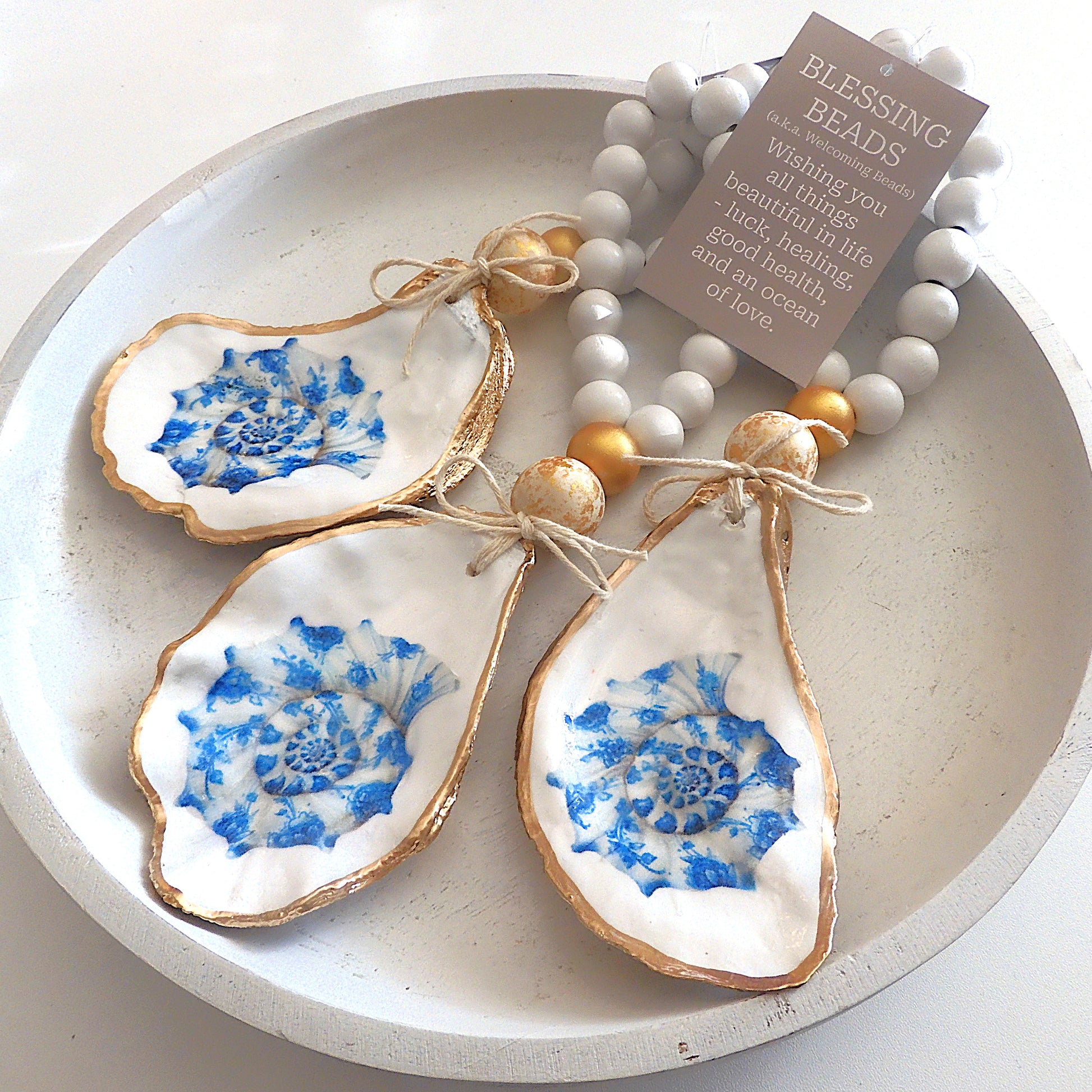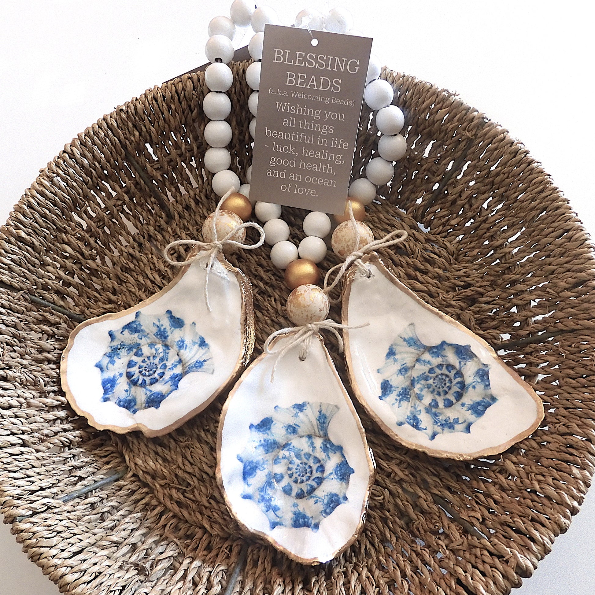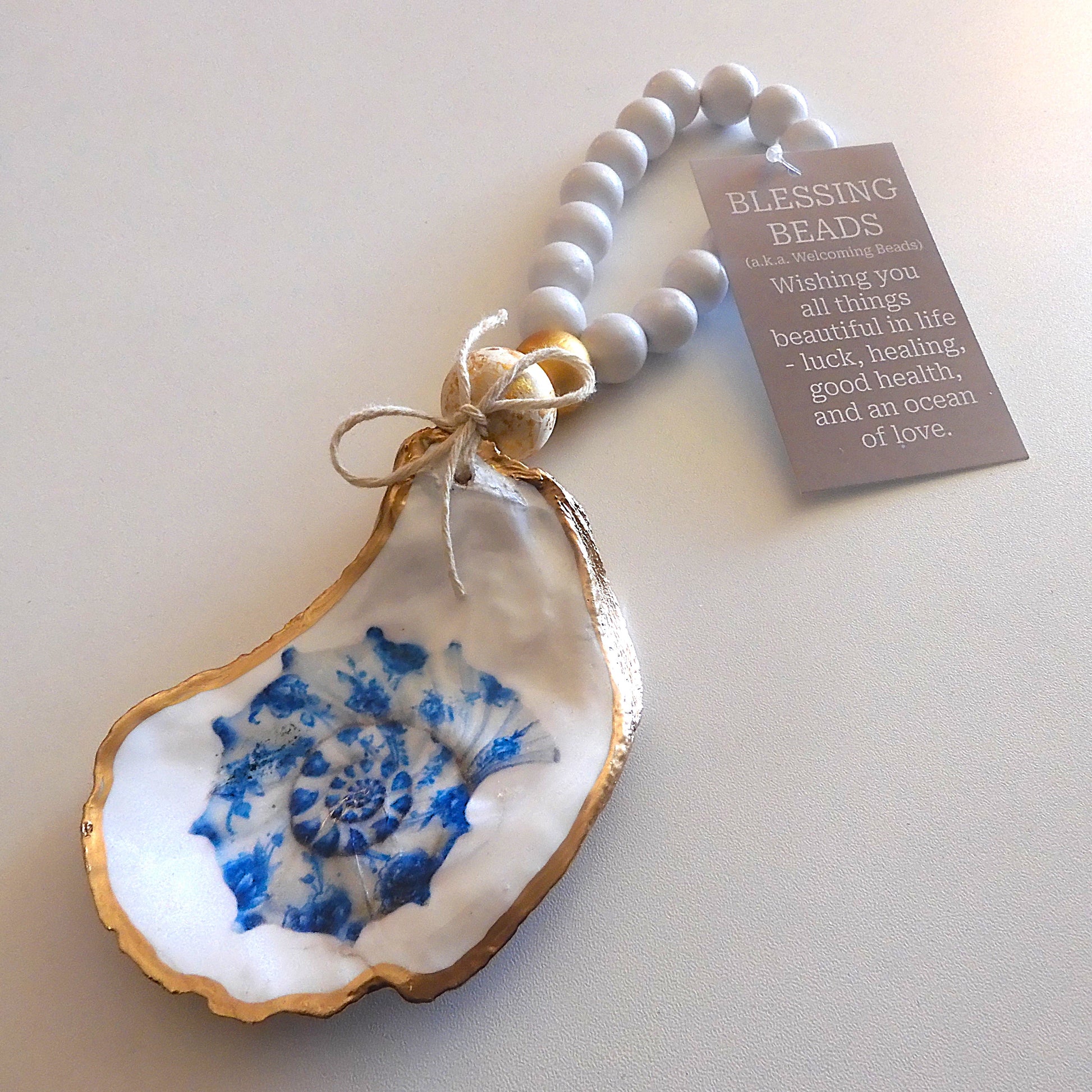 Blessing Beads (a.k.a. Welcoming Beads) are meant to attract all things beautiful in life - luck, healing, and good wishes. These wooden beads with loop and decoupage oyster shell look gorgeous in any space - wrap them on a door handle, drape them on a frame or mirror, display them on a bottle, or simply place them on top of stacked books or in a tray. They are handmade with an ocean of love to bless your home with peace, love and joy.