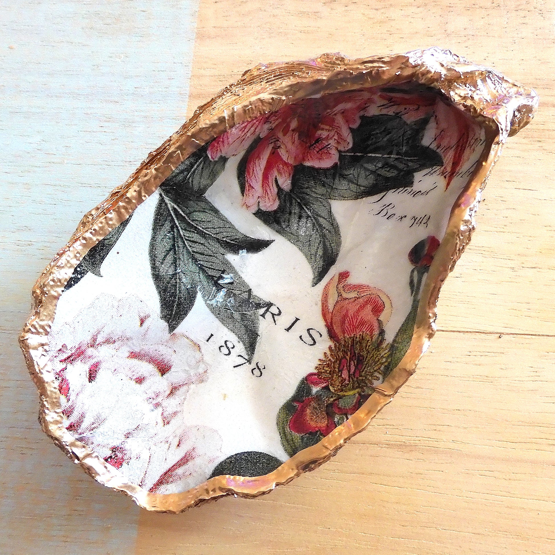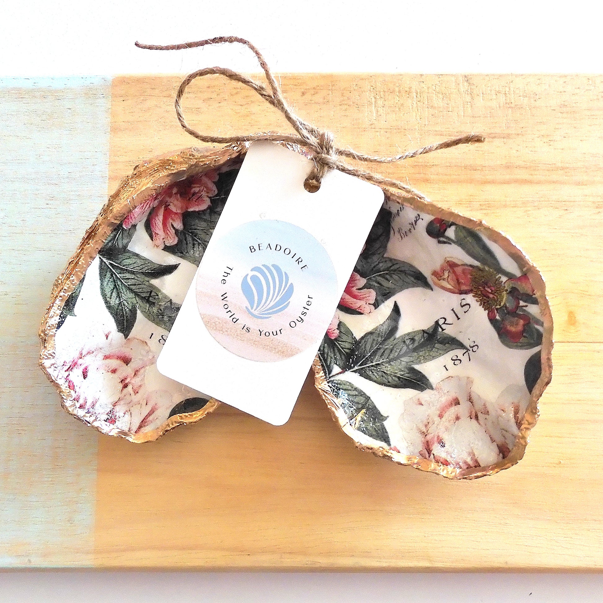 Each oyster shell is meticulously hand-embellished with decoupage paper, creating a stunning trinket dish for your rings, earrings, or other cherished jewelry. No two dishes are alike, making each one a one-of-a-kind treasure.