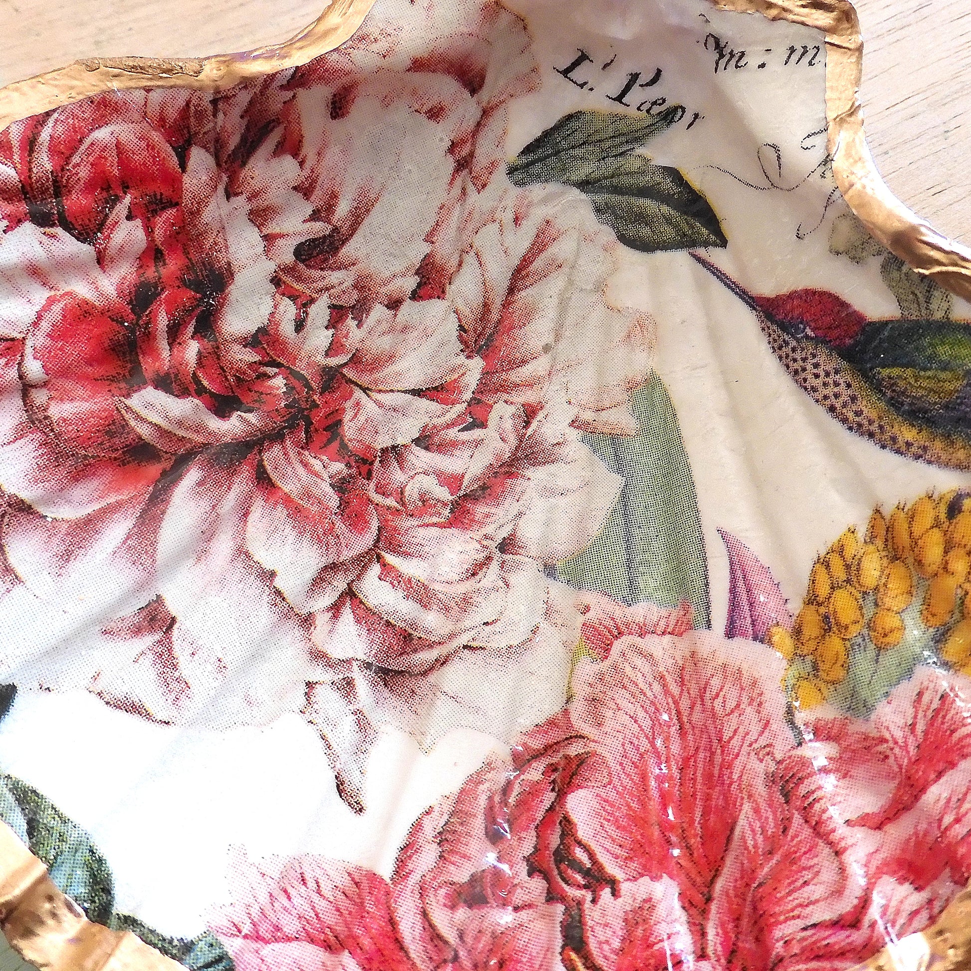Each shell trinket dish is individually hand crafted and is one-of-a-kind creation, not manufactured in a factory. As a result, each scallop shell trinket dish will have subtle variations from one item to the next, which is caused by natural variations in the shape, size, colouration and texture of the sea shells used, as well as a result of the hand decoupaging pattern placement.
