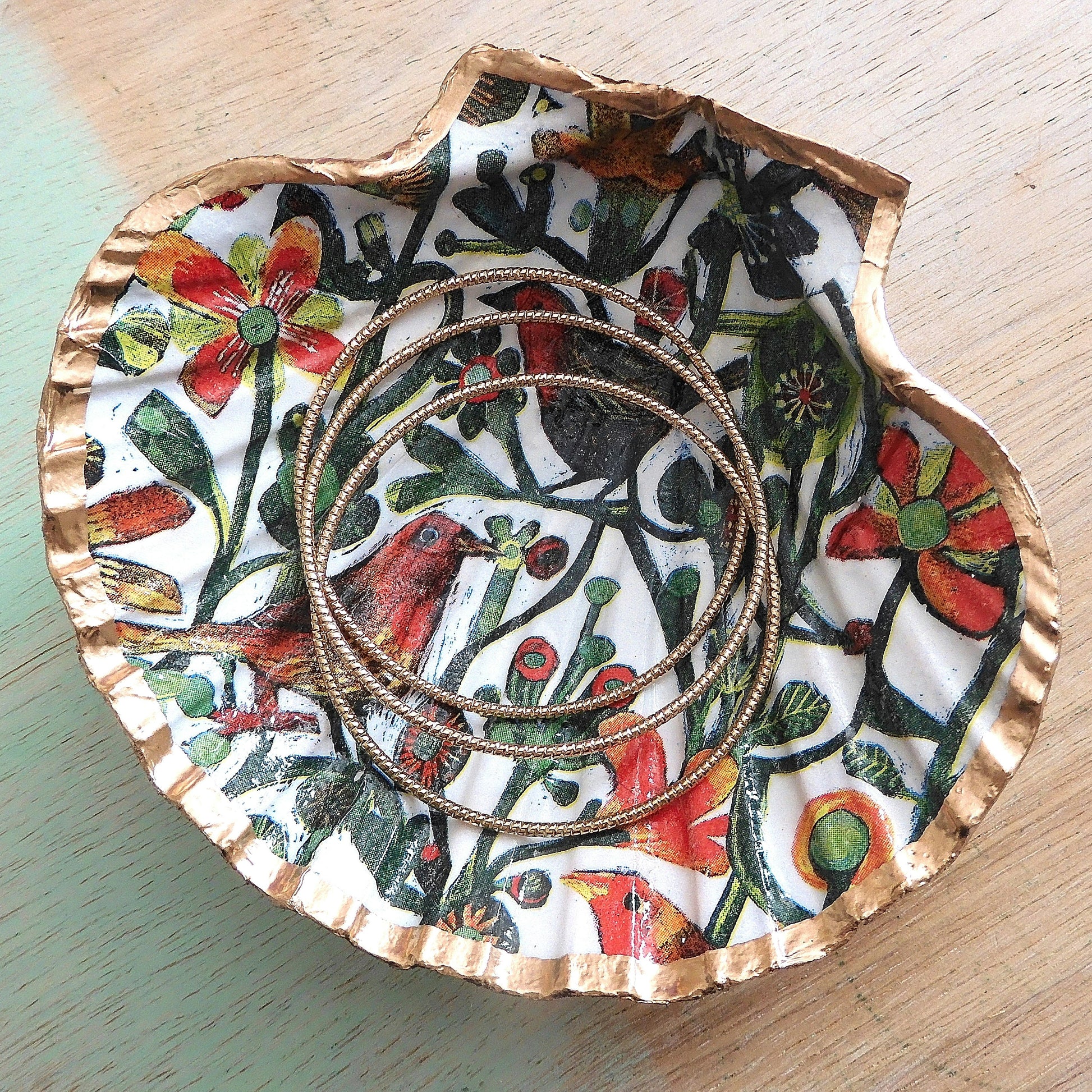 Each shell trinket dish is individually hand crafted and is one of a kind creation. As a result, each scallop shell trinket dish will have subtle variations from one item to the next, which is caused by natural variations in the shape, size, coloration and texture of the sea shells used, as well as a result of the hand decoupaging pattern placement.