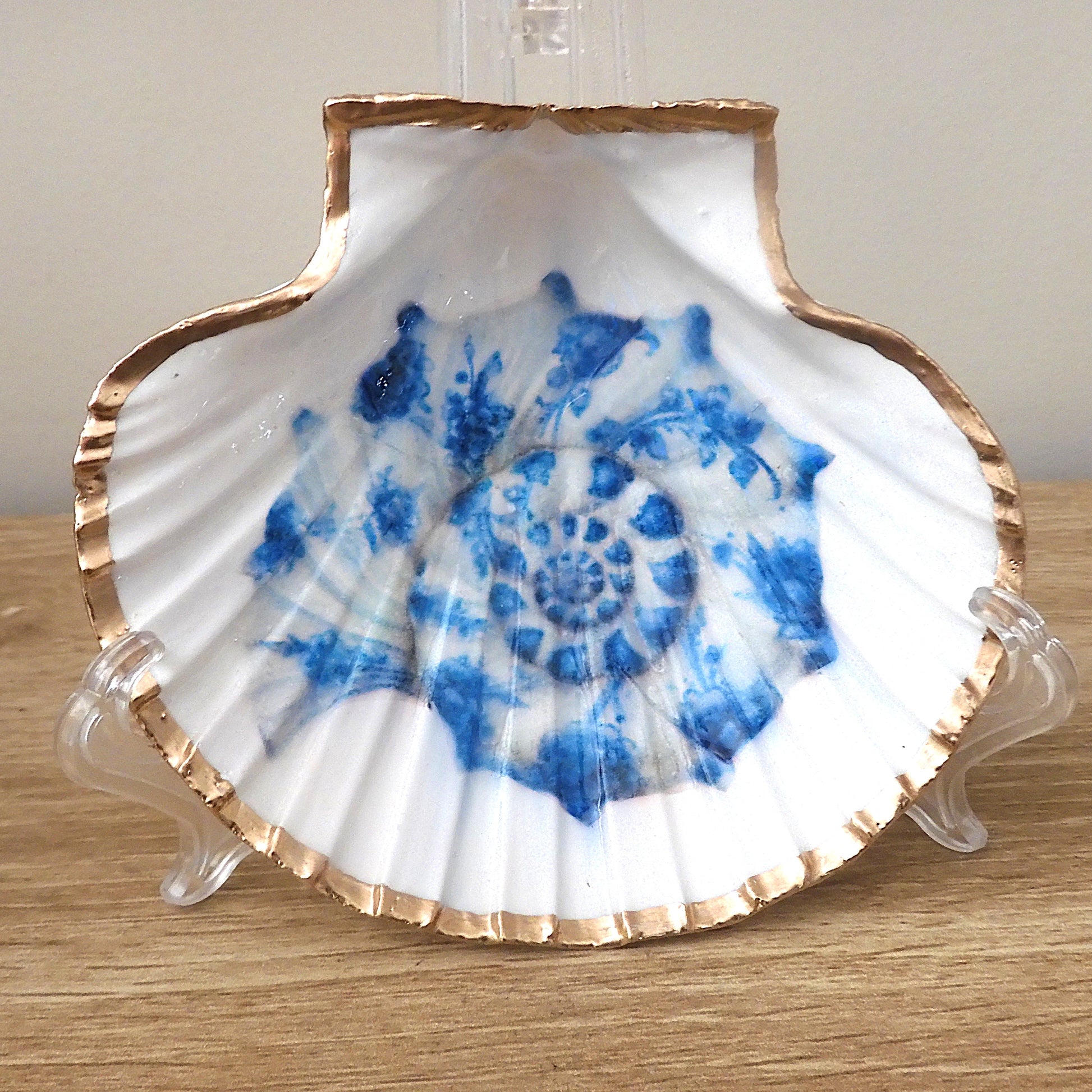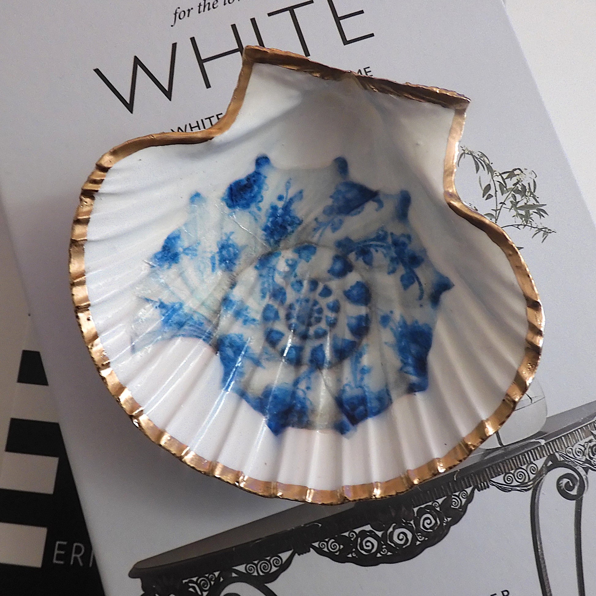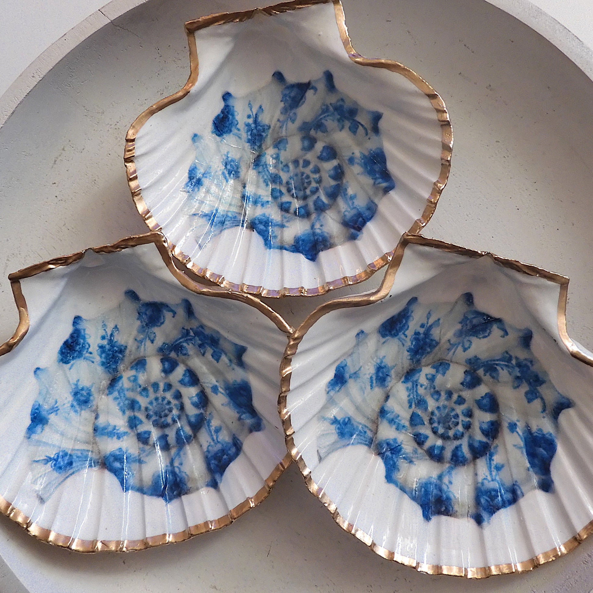 Each of these scallop shell trinket dishes has a liquid gold leaf edge and gold leaf reverse side. Please note they are NOT food safe and should not be used for this purpose.
