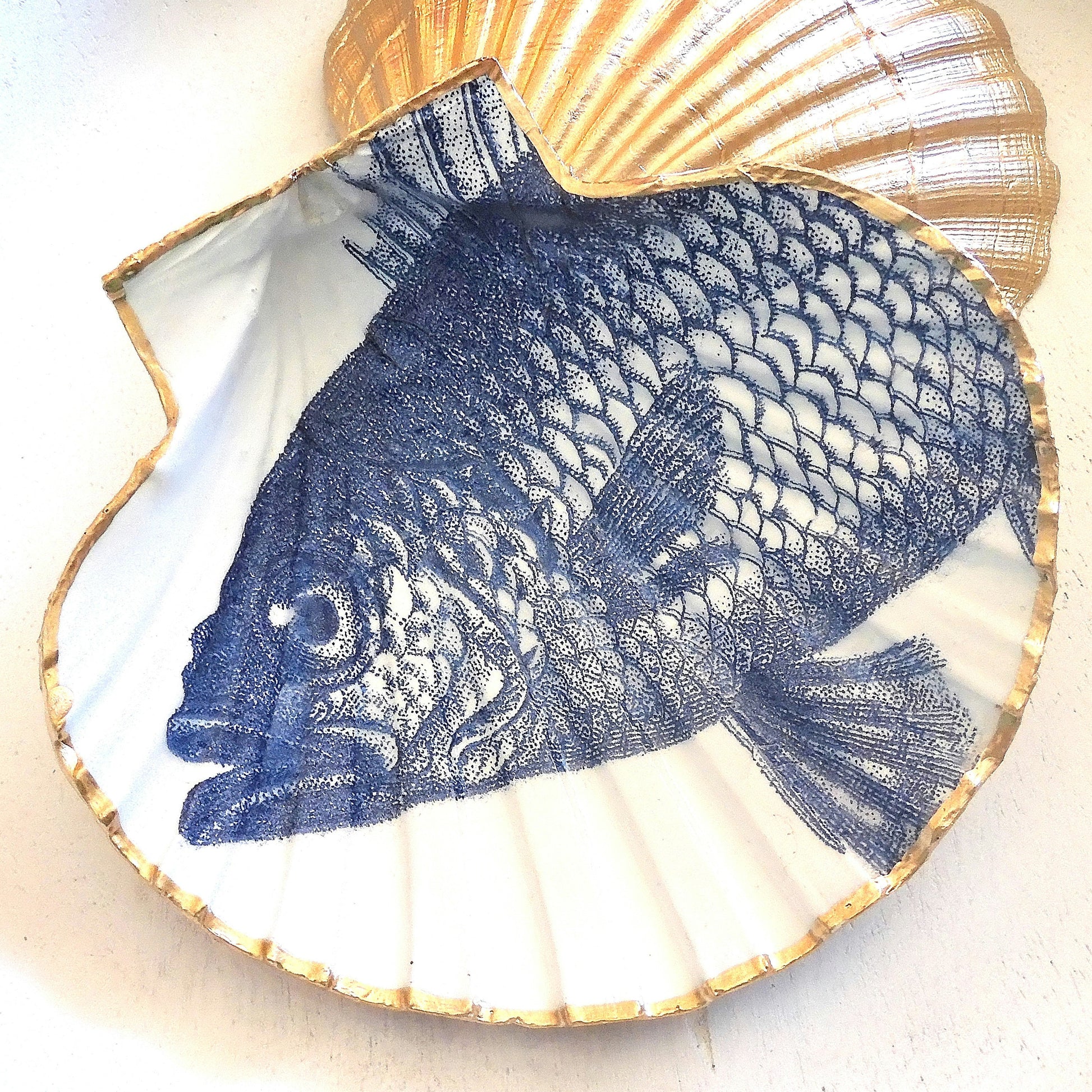 Each of these scallop shell trinket dishes has a liquid gold leaf edge and gold leaf reverse side. Please note they are NOT food safe and should not be used for this purpose.
