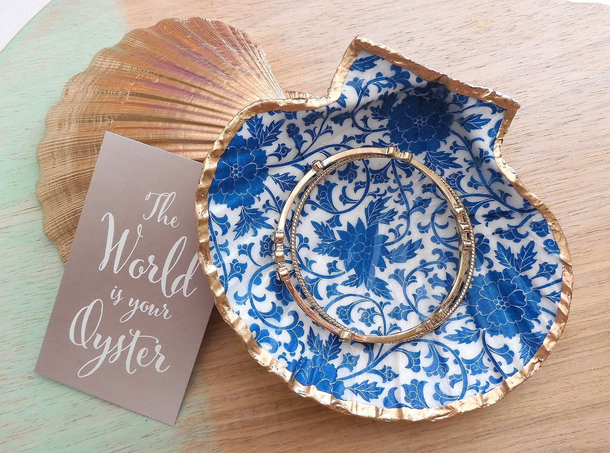 Each shell trinket dish is individually hand crafted and is one-of-a-kind creation. As a result, each scallop shell trinket dish will have subtle variations from one item to the next, which is caused by natural variations in the shape, size, coloration and texture of the seashells used, as well as a result of the hand decoupaging pattern placement.