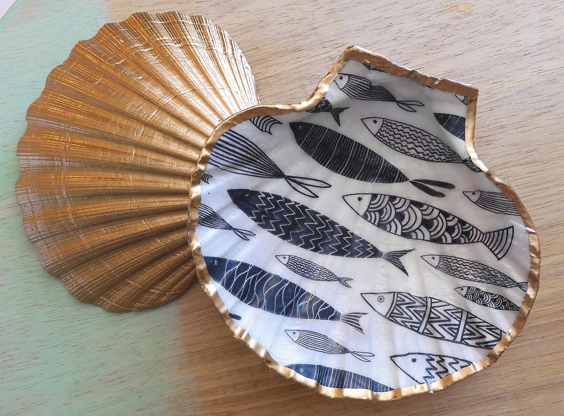 Each shell trinket dish is individually hand crafted and is one of a kind creation. As a result, each scallop shell trinket dish will have subtle variations from one item to the next, which is caused by natural variations in the shape, size, coloration and texture of the sea shells used, as well as a result of the hand decoupaging pattern placement.